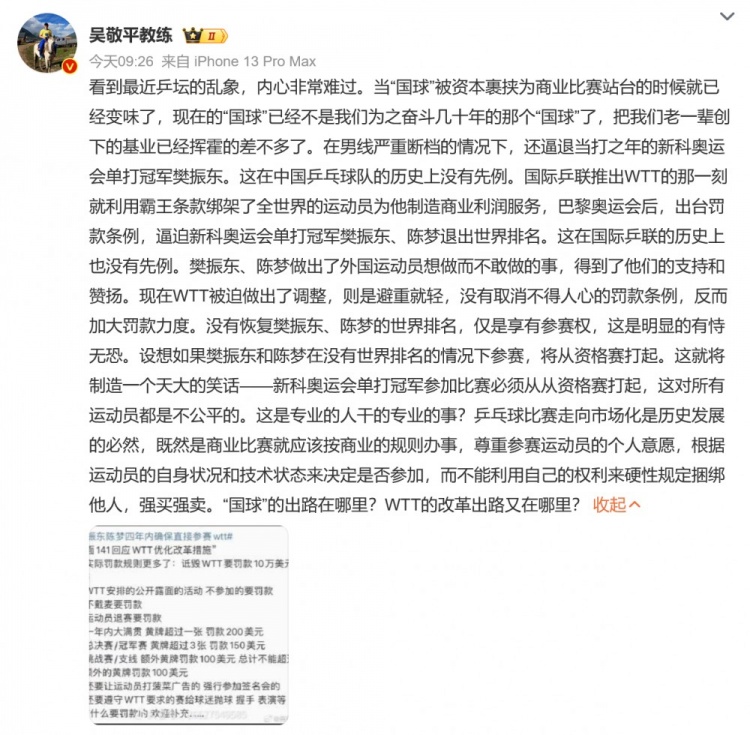 DB视讯官网02月16日讯 2月15日,国乒功勋教练吴敬平发博,直指近期发布进行赛制改革的WTT,认为国球被商业裹挟变味。